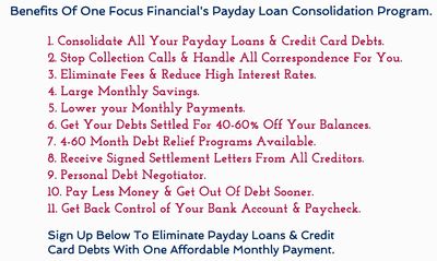 If you are struggling with payday loan debt or installment loan debt and can't keep up with the extremely high interest, fees, and bi-weekly payments. One Focus Financial can consolidate all your debts into one affordable monthly payment. Then our debt negotiators can settle your debts for typically 40-60% off the balances.